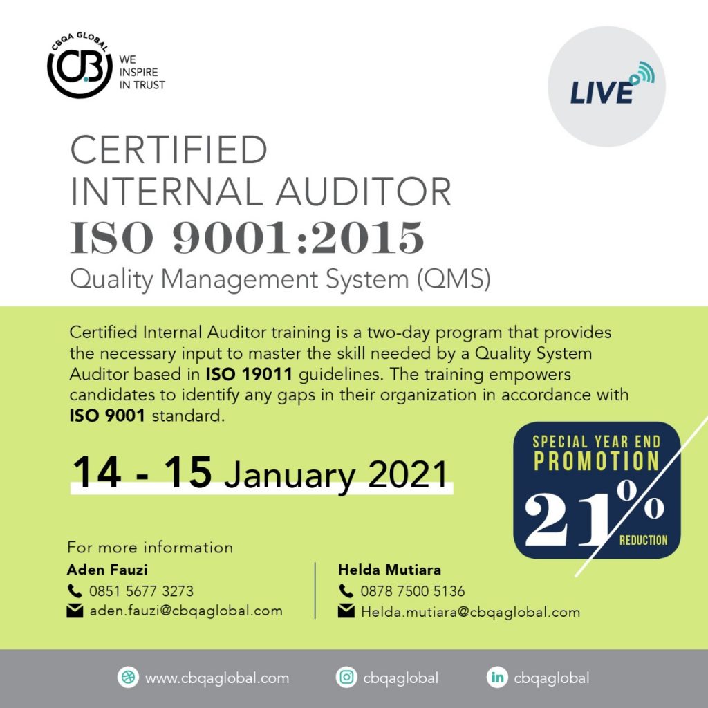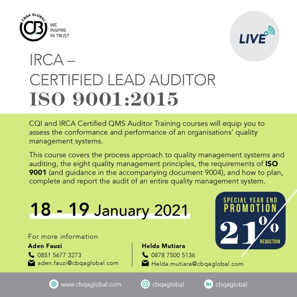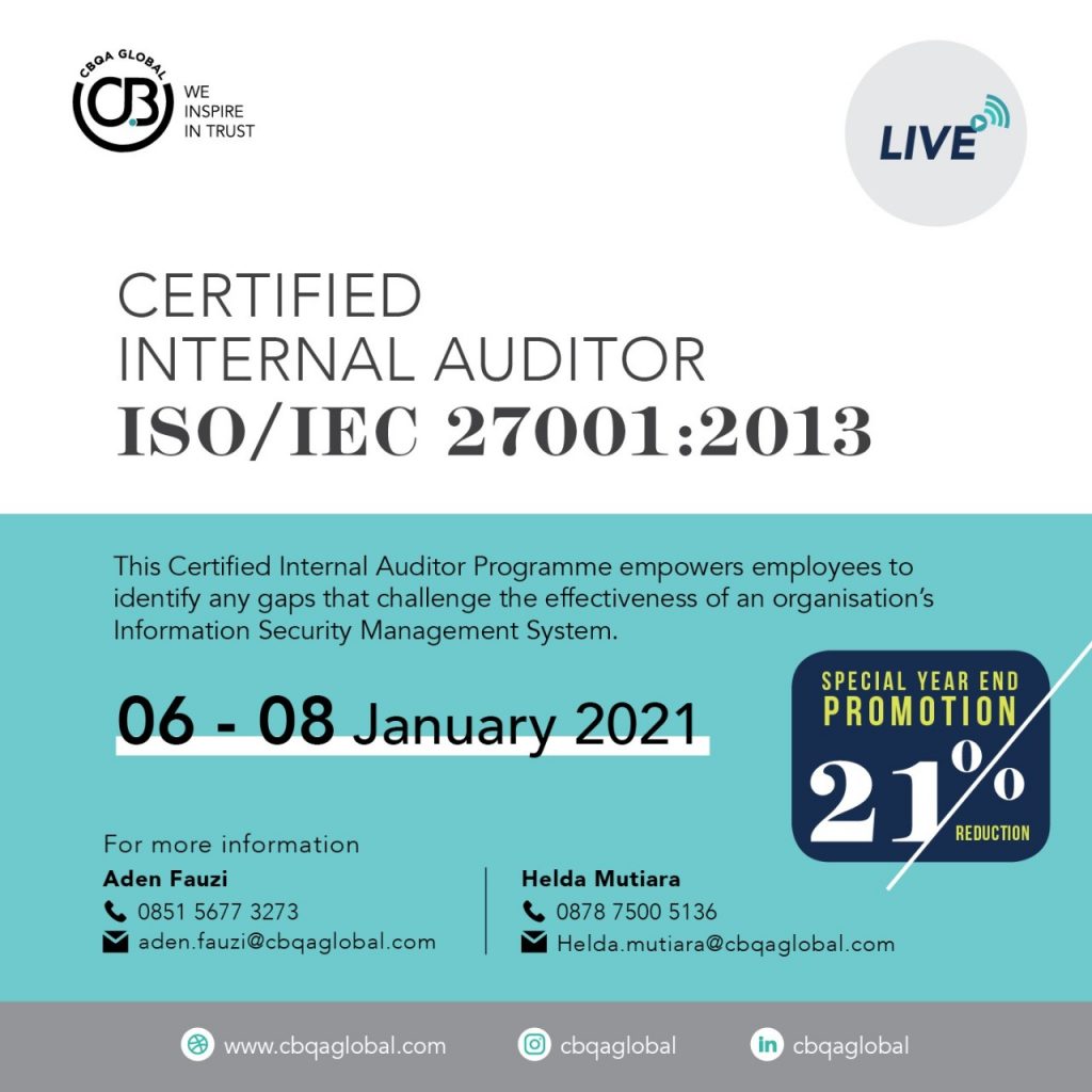 Program Certified Lead Auditor ISO/IEC 27001: 2013 dari CBQA GLOBAL bertujuan untuk memberikan pelatihan bagi Auditor dan Lead Auditor Sistem Manajemen Keamanan Informasi (ISMS) yang potensial.